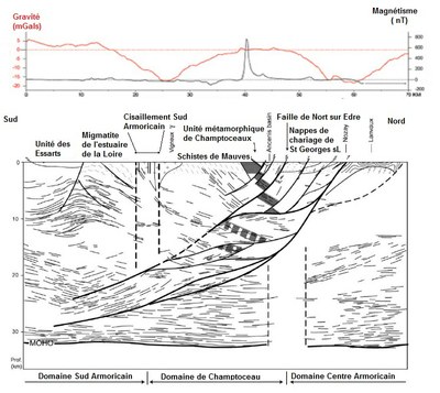 Exemple de l'axe de Champtoceaux L'axe lourds de Champtoceaux présente un magnétisme élevé (courbe noire figure ci-contre). Ce magnétisme est attribué à la présence de roches ayant subit un métamorphisme de hautes pression (faciès des éclogites - en grisé sur le profil sismique). Ce métamorphisme a été daté de manière isotopique à 385 Ma (fin du Dévonien moyen). Ces roches métamorphiques chevauchent vers le Nord à cause de mouvements postérieurs d'age Carbonifère supérieur. |