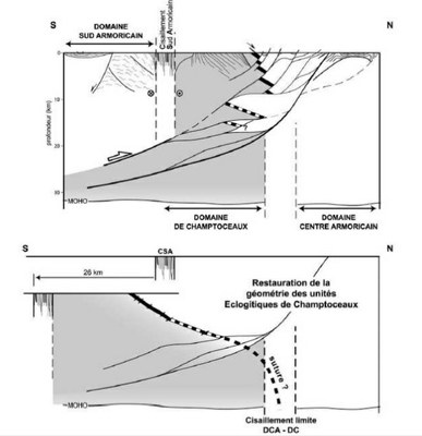 Gumiaux C., Judenherc S., Brun J.P., Gapais D., Grantet M. & Poupinet G., 2004. Restoration of lithospheric-scale wrenching from integrated structural and tomographical datas (Hercynian belt of western France). Geology, 32, 333-336.