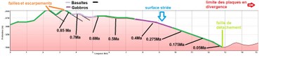 - Pointer sur le transect de la feuille de compte-rendu (fichier pdf : "transect Kane OCC") la "Faille de détachement" et les "Failes et escarpements"