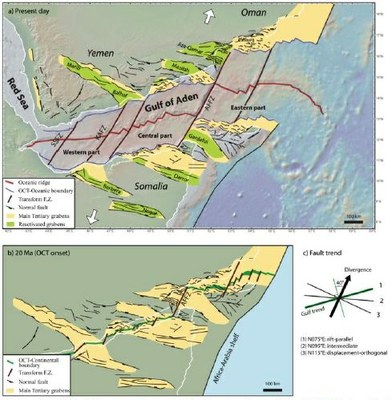figure 15. Carte structurale du Golf D'aden et reconstruction au début de l'extension(45).