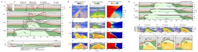 Les travaux récents (9,11,12,13,16,19) décrivent 5 phases : étirement, amincissement, exhumation, rupture lithosphérique et accrétion stable.