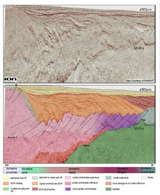 Par ailleurs, elles sont intensément percolées et déformées (feuilletage). On retrouve aussi ces zones de manteau exhumé de l'autre coté de l'Atlantique le long de la marge Canadienne (figs. 7 et 8) sous forme d'un réflecteur sismique recouvert par les sédiments.