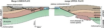 Cependant la répartition géographique des portions Upper et Lower est la aussi très "cahotique" puisque sur la même marge on peut observer la succession de domaines Upper et Lower (fig. 22). Les études ont pu mettre en évidence que latéralement on passe d'une Upper à une Lower par deux types de jonctions, soit par une coupure nette (sharp trasfert) par le biais d'une faille soit par une zone diffuse (diffuse transfert). Ce second type de frontière semble être le résultat de la délamination d'un haut topographique.