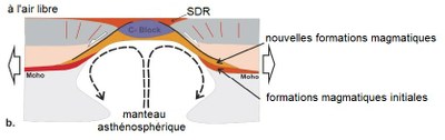 Les données sismiques permettent d'observer des zones étroites de striction syn-magmatique de la croûte supérieure (fig. 37). Le Moho n'est pas à une profondeur homogène dans toute la zone. Au coeur de la zone il est le plus profond (33 +/- 1 km) et remonte en périphérie (25 +/- 1 km). On distingue ainsi l'individualisation d'un Bloc Continental crustal central (C-bloc) encadré de zones de strictions de la croûte inférieure injectée de magma. En surface se mettent en place des coulées volcaniques formant les S.D.R. (Seaward Dipping Reflector, fig. 38) et en profondeur des formations plutoniques L.C.B.s (Lower Crustal Bodies). Ce sont des cumulats gabbroïques à olivine, produits par la fusion partielle du manteau. Dans certaines marges ces formations profondes sont associées, dans des proportions assez importantes, à des restes de la croûte continentale inférieure de faciès de haute pression (granulites et éclogites)33; ceci qui montre que leur mise en place ne nécessite pas obligatoirement un important gradient thermique en relation avec la plume mantellique.