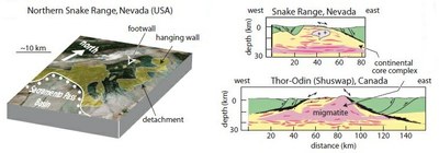 La déformation se focalise sur une zone moins étendue dont la croûte va s'amincir rapidement jusqu'à une dizaine de kilomètres d'épaisseur formant un domaine hyper-étiré. On en retrouve les traces aujourd'hui dans les "zones d'étranglement - necking domains" des T.O.C.. La déformation cassante de la croûte ne permet pas d'expliquer l'amincissement mais les profils sismiques permettent d'observer que la déformation n'est pas accomodée uniformément avec la profondeur et l'amincissement se réalise par le développement de failles de détachement. On peut étudier ces mécanismes à l'affleurement le long de la Cordillière Nord Américaine (20) où l'on peu observer l'exhumation de croûte continentale (C.C.C. : Continental Core Complexe, fig. 25).