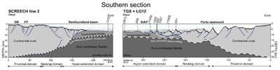 La synthèse(9,12) des travaux des transects Nord (fig. 9) et Sud (fig. 10) différencie donc un domaine proximal constitué de croûte continentale fracturée, qui est suivi d'une zone d'étranglement (Necking Zone) d'une 50aine de km où la croûte s'amincie jusqu'à environ 10 km d'épaisseur. Cette croûte isole parfois des "hauts topographiques" (ex : Flemisch Cap ).