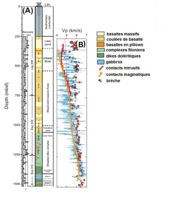 figure 4 : Log interprété (A) et mesure de la vitesse des ondes sismiques (B) de E.P.R. (O.D.P.1256D)
