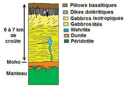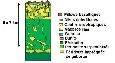 Jusqu'aux années 90 la lithosphère océanique était vue comme une structure d'épaisseur et de constitution homogènes repésentée par une croûte constituée de laves sous forme de coulées (pillow lava), recouvrant des filons doléritiques (dikes) l'un et l'autre issus de l'injection verticale de magma depuis une chambre magmatique et constituant une couche de 1 à 2 km d'épaisseur. Sur les parois de cette chambre magmatique cristallisant, plus lentement, de gros cristaux formaient les gabbros. Cette portion plutonique représentait une épaisseurs d'environ 4 à 5 km. L'ensemble de ces roches, constituant une croûte d'une épaisseur de l'ordre de 5 à 7 km, reposait par le biais de la discontinuité du Moho sur les péridotites du manteau lithosphèrique (fig.1). Ce modèle classique est dit de Penrose (c.a.d. définit lors de la conférence de Penrose; organisée par la Geological Society of America; en 1972).