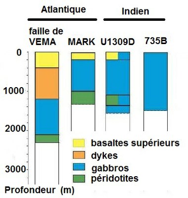 figure 3. Schéma simplifié du résultat de différents forages réalisés de 1974 à 2004 dans les croûtes océaniques de l' Atlantique et du Sud de l'Océan Indien (1)