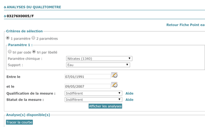 Remplir les critères de sélection, en particulier le paramètre chimique, puis valider. Sous le tableau de synthèse, cliquer sur le bouton "Tracer la courbe" |