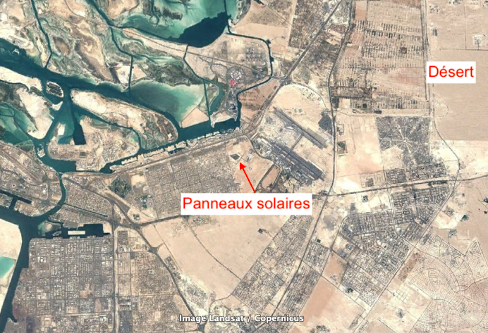 Abu Dhabi est situé aux Emirats Arabes Unis. La région est désertique. Pour pouvoir produire de l'énergie renouvelable, des panneaux solaires ont été mis en place. |
