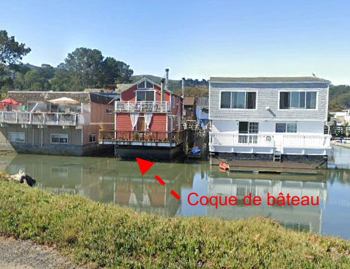 Observe la base des maisons. Sur quoi sont-elles construites ? | Les maisons sont construites sur l'eau et reposent sur des coques de bâteaux. |