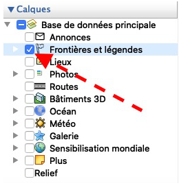 1) Dans "Calques" (ou "Données géographiques") : cocher frontières et légendes . 2) Pour dézoomer agir comme indiqué ci-contre.