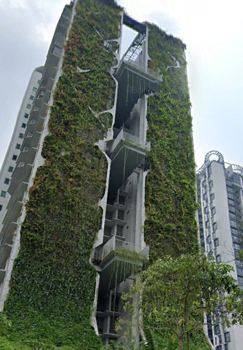 Tous ces immeubles se situent à Singapour. Le projet Pinnacle Duxton comporte deux longs jardins du ciel de plus de 500 mètres chacun, sur les deux étages 26e et 50e. Les 7 tours connectées sont collectivement les plus hauts bâtiments résidentiels publics du monde. Sur les façades de ces immeubles, nous observons des végétaux. |
