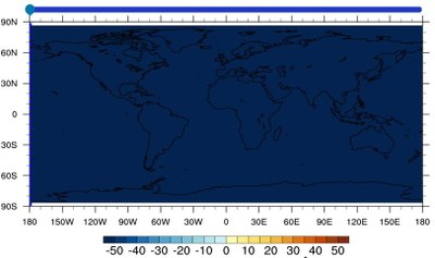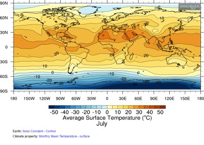 Ce travail peut faire suite au second, mais au cas où il est réalisé indépendamment, les étapes de la découverte de la répartition des températures en février et en aout sont a faire avant de réaliser le travail proposé ci-dessous. Modifier juste dans la consigne initiale le paramétrage du menu déroulant en choisissant "Axial tilt" à la place de "Solar constant" puis dans le second menu déroulant choisir "23.44° (current)" qui correspond à l'angle actuel de l'inclinaison de l'orbite sur son axe.