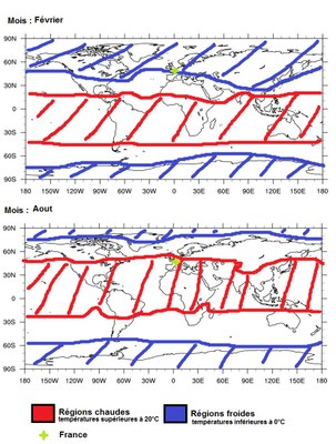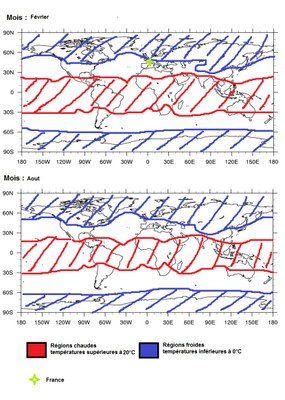 On voit bien que la répartition des zones froides et chaudes est quasiment identique en février et en août. l'inclinaison de la terre est donc responsable des saisons.