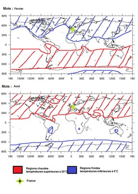 Que ce soit en février ou en août il n'y a pas de grosses variations des zones chaudes et froides. On peut donc conclure que la terre a actuellement une orbite proche du circulaire.