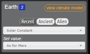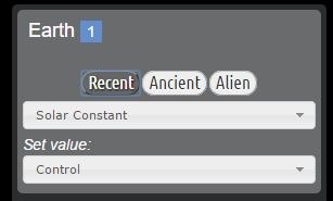 - Dans la fenêtre "Earth 1", choisir : "Recent", puis dans le menu déroulant choisir "Solar constant" et dans le nouveau menu déroulant choisir "Control" afin de paramétrer le modèle Terre de référence.