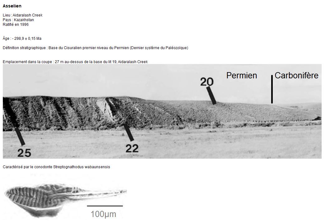 Les clous dont les noms apparaissent en noir (ci-contre Gzhelien) n'ont pas encore été déterminés contrairement à ceux dont le nom apparait en bleu (ci-contre Asselien) et dont les caractéristiques (emplacement géographique, âge, définition stratigraphique, emplacement dans l'affleurement et éléments caractérisant le début de l'étage) sont données en cliquant sur le nom de l'étage