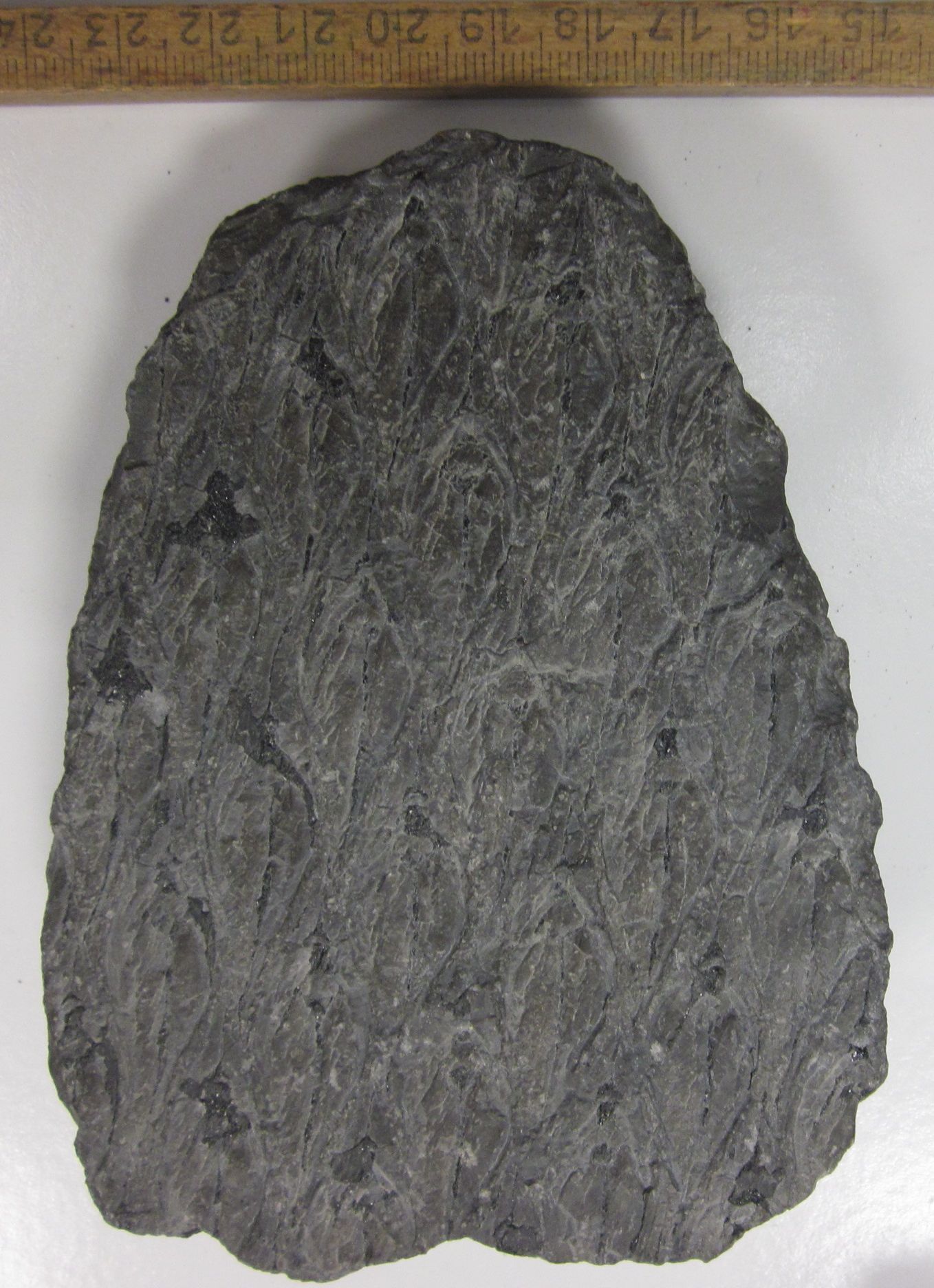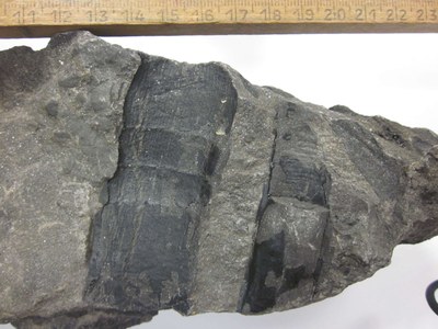 Photo 1. Roche carbonée présentant les motifs fossilisés du tronc de lépidodendron. |