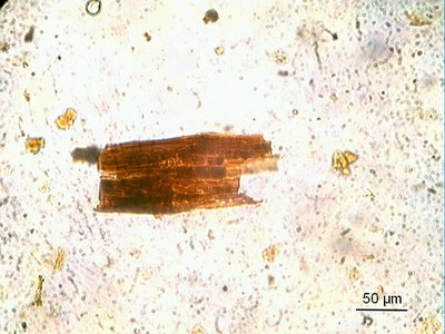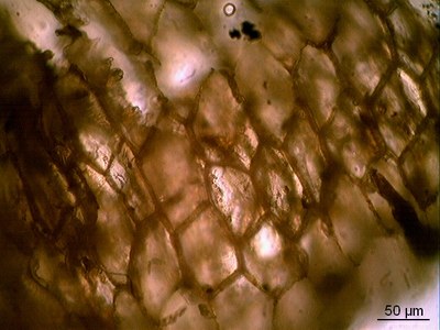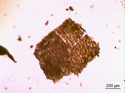 Photo 7. Fragment de tissu végétal issu d'un échantillon de houille au microscope optique (x400). |