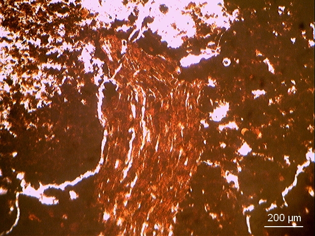 Photo 6. Fibres de bois présumées dans un échantillon de lignite au microscope optique (x100). |