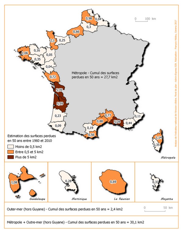 L'état des lieux est assez inquiétant. La puissance de l'érosion, combinée à la montée des eaux, fait reculer les dunes, érode les falaises, engendre éboulements et submersion marine. Au moins 22 % des côtes reculent, de 10 cm jusqu’à 8 m par an en moyenne. En France, 142 communes enregistrent un retrait de 50 cm par an, et dix-neuf de plus de 3 m. Selon les services du ministère de l’Environnement, le remodelage du littoral correspond à la disparition de 3.100 terrains de rugby en un demi-siècle, de 1949 à 2005, soit 26 km2. Autrefois, les hommes ne s'installaient pas ou peu sur les côtes sableuses (ils en connaissaient la mobilité) mais l'urbanisation du littoral, depuis 150 ans, a changé la donne.
