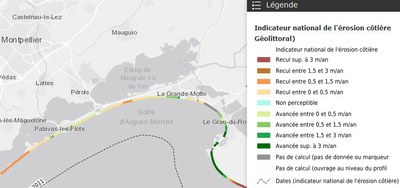 Notion de "trait de côte" : Le SHOM (Service hydrographique et océanographique de la Marine) définit le trait de côte comme le niveau des plus hautes mers dans le cas d’une marée de coefficient 120 et dans des conditions météorologiques normales : pas de vent du large, pas de dépression atmosphérique. Néanmoins, dans le cadre des travaux de l’OCA (Observatoire Côte Aquitaine), une définition plus pratique du trait de côte est adoptée, répondant à des critères géomorphologiques permettant de faciliter sa cartographie en Aquitaine. Pour la côte sableuse : séparation entre la dune et la plage correspondant, selon la configuration géomorphologique, à un ou plusieurs indicateurs (le pied de falaise dunaire, la rupture de pente topographique, la limite de végétation dunaire, un ouvrage de protection longitudinal). Pour la côte rocheuse : séparation entre la falaise et l’estran correspondant, selon la configuration géomorphologique, à un indicateur tel que le sommet ou le pied de la falaise rocheuse, un ouvrage de protection longitudinal ou les mêmes indicateurs que pour une côte sableuse.