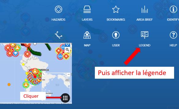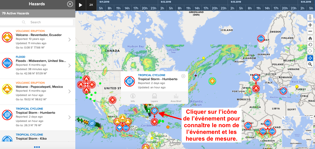 A l'ouverture du site apparait la liste des derniers événements : 1) cliquer sur l'événement recherché puis 2) fermer "Hazards"
