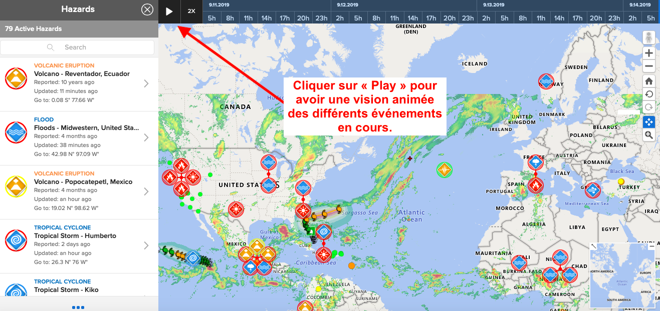Le site "disasteralert" : https://disasteralert.pdc.org/disasteralert/ permet en temps réel de visionner les lieux et données à l'échelle planétaire sur : des incendies, inondations, cyclones, séismes et tsunamis, volcanisme ..