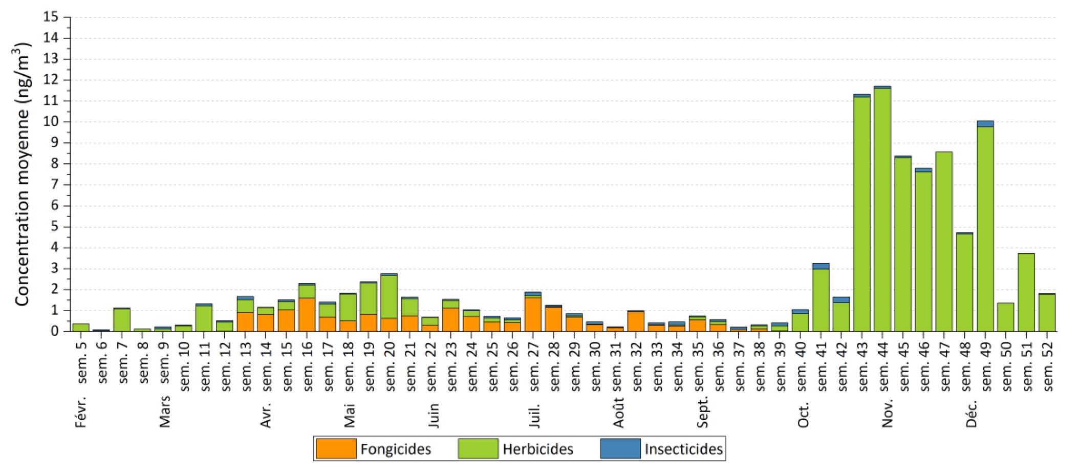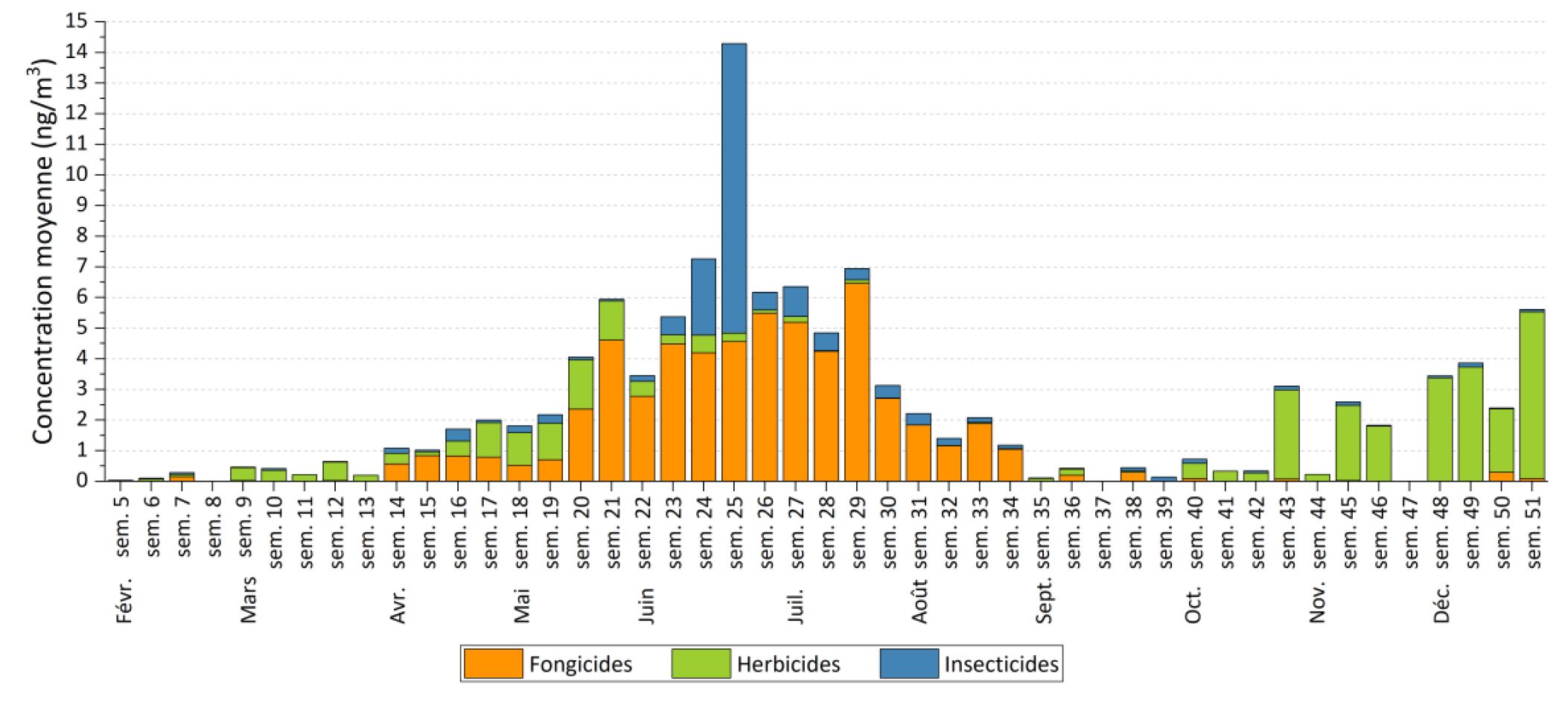 Les données relatives à la contamination de l'air par les pesticides demeurent fragmentaires. Alors que lors de leur utilisation, les substances actives peuvent être transférées dans l’atmosphère par le vent, l’érosion éolienne et la volatilisation, il n’existe pas de valeur réglementaire dans l’air. Au niveau national, sur les sites permanents et la période 2015-2017, on constate la présence des substances actives suivantes : Herbicides : • Pendiméthaline • Triallate • s-Métolachlore • Prosulfocarbe • Diméthénamide(-p) Les concentrations en pesticides dans l’air varient selon les saisons et selon les cultures. |