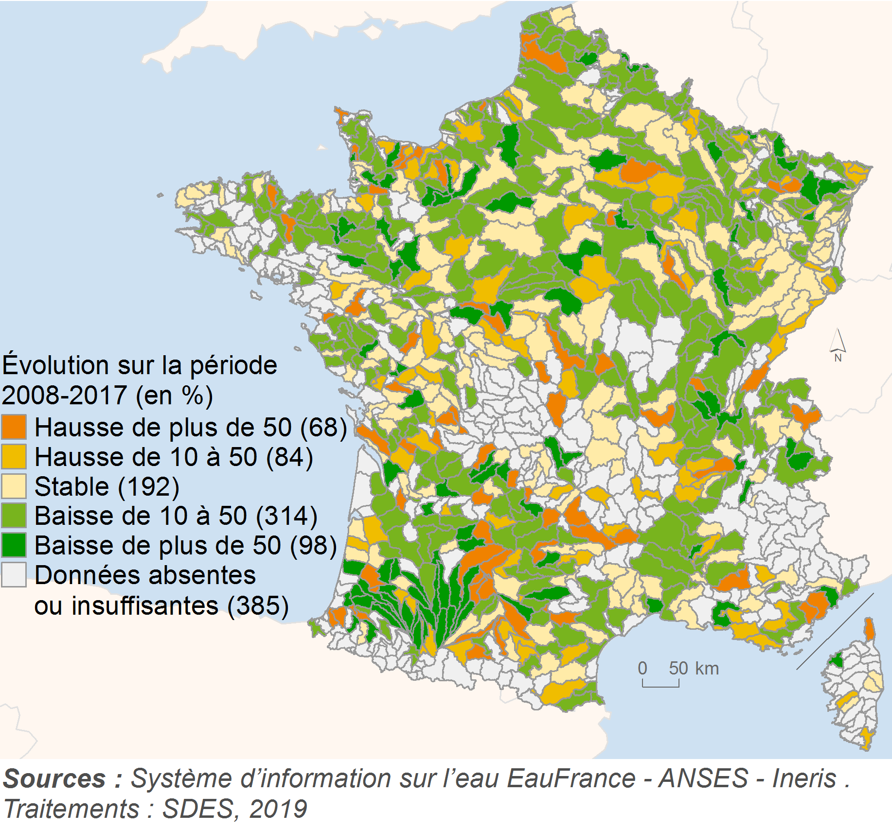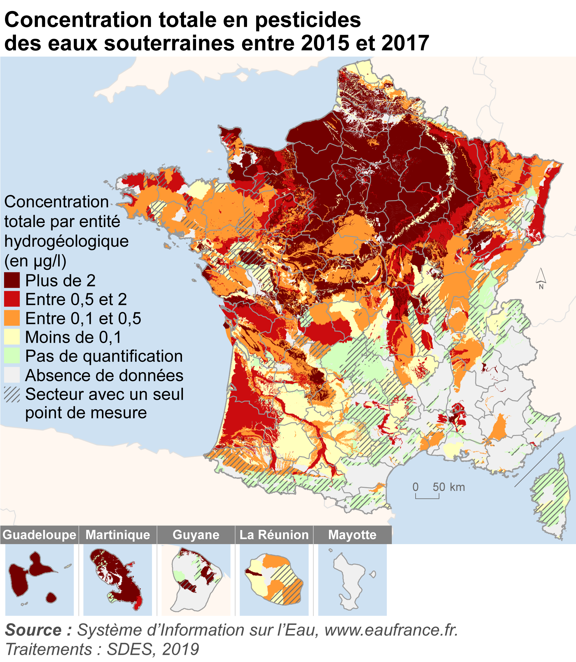 Pesticides dans les eaux souterrainesEn 2017, plus de 300 substances actives de la catégorie des pesticides sont retrouvées dans les eaux souterraines. La surveillance des pesticides dans les eaux se heurte en outre à l’introduction de nouvelles substances dont la détection nécessite des dispositifs de mesure de plus en plus performant. Les substances autorisées les plus retrouvées en 2017 sous leur forme d’origine ou partiellement dégradée sont les suivantes : Diméthachlore,Métolachlore, Bentazone, Glyphosate . Plusieurs substances interdites d’usage en 2017 sont encore détectées dans les eaux souterraines : Atrazine, Simazine ...