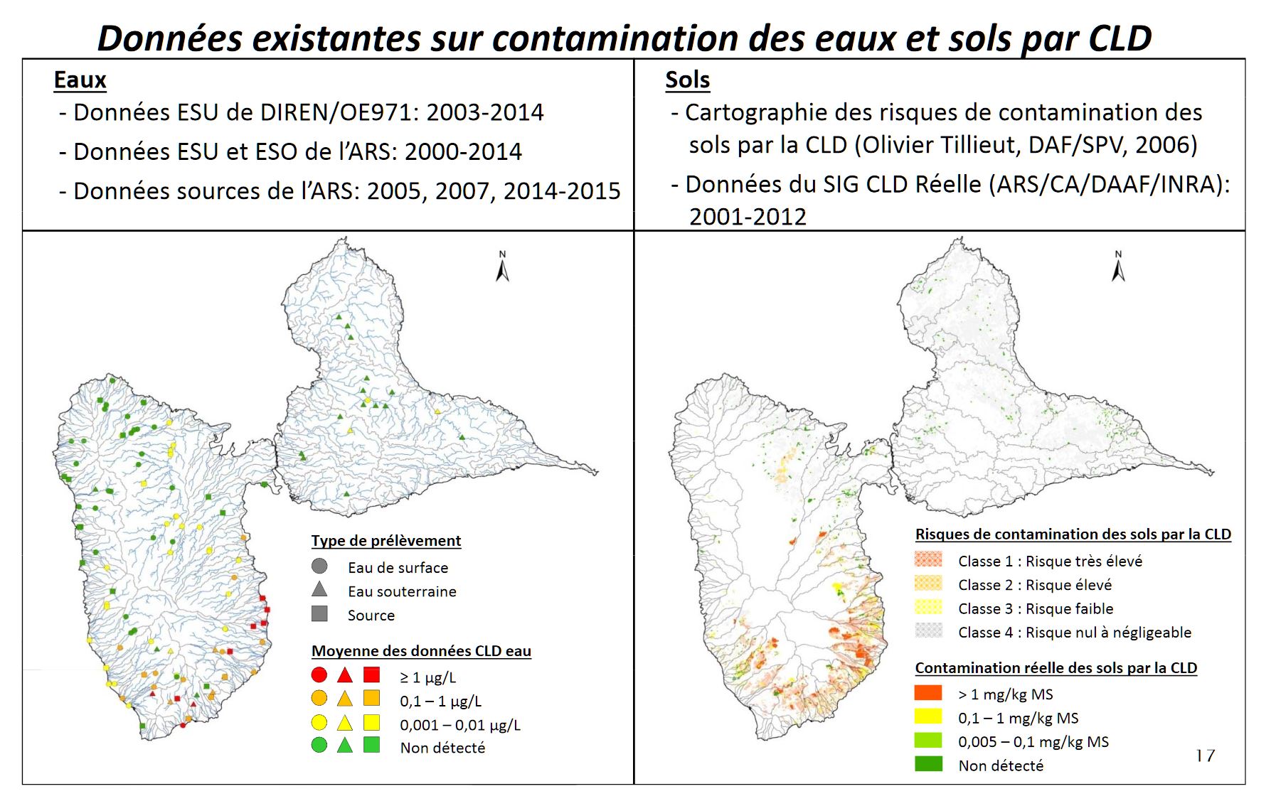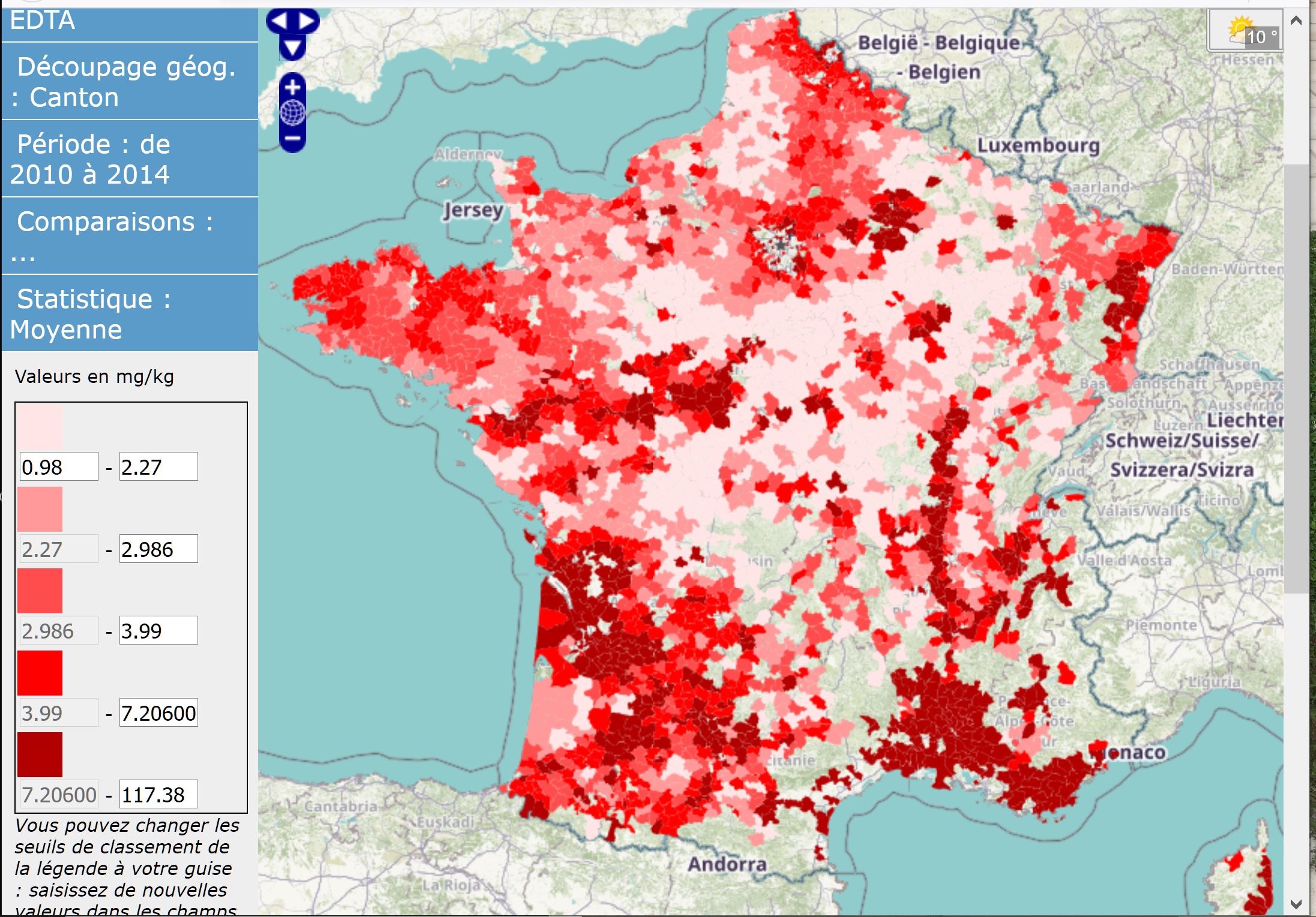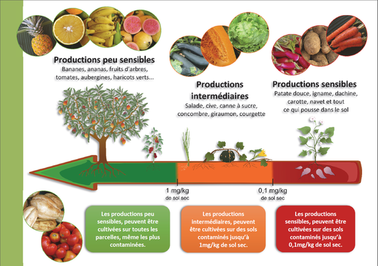 Des exemples de contamination particulière des sols sont bien connus et documentés (cuivre, chlordécone...). Contamination des sols par le cuivreMoyenne des teneurs en Cuivre EDTA pour la période début 2010 à fin 2014, découpage par canton Les zones où les teneurs sont les plus élevées correspondent aux régions viticoles ayant largement recouru aux traitements à la bouillie bordelaise, où de nombreuses teneurs dépassent 10 mg Cu.kg-1. Des teneurs beaucoup plus faibles (inférieures à 1 mg Cu.kg-1) apparaissent, notamment dans les régions très calcaires de la Marne, l'Aube et la Haute Marne. Contamination des sols par la chlordécone aux AntillesAux Antilles, la pollution agricole des sols, des eaux et des écosystèmes par la chlordécone résulte de son utilisation jusqu’en 1993 pour lutter contre un insecte ravageur, le charançon des bananiers. Elle est classée comme polluant organique persistant et reconnue comme perturbateur endocrinien et cancérogène potentiel Un quart de siècle plus tard, sa molécule se retrouve dans le sang de 95 % des Guadeloupéens, selon les résultats d’une étude de Santé publique France publiée en 2018. La chlordecone les a contaminés en se répandant dans les sols, les rivières et même la mer, touchant toutes les chaînes alimentaires. Productions agricoles possibles en fonction de la quantité de chlordécone détectée dans le sol : |