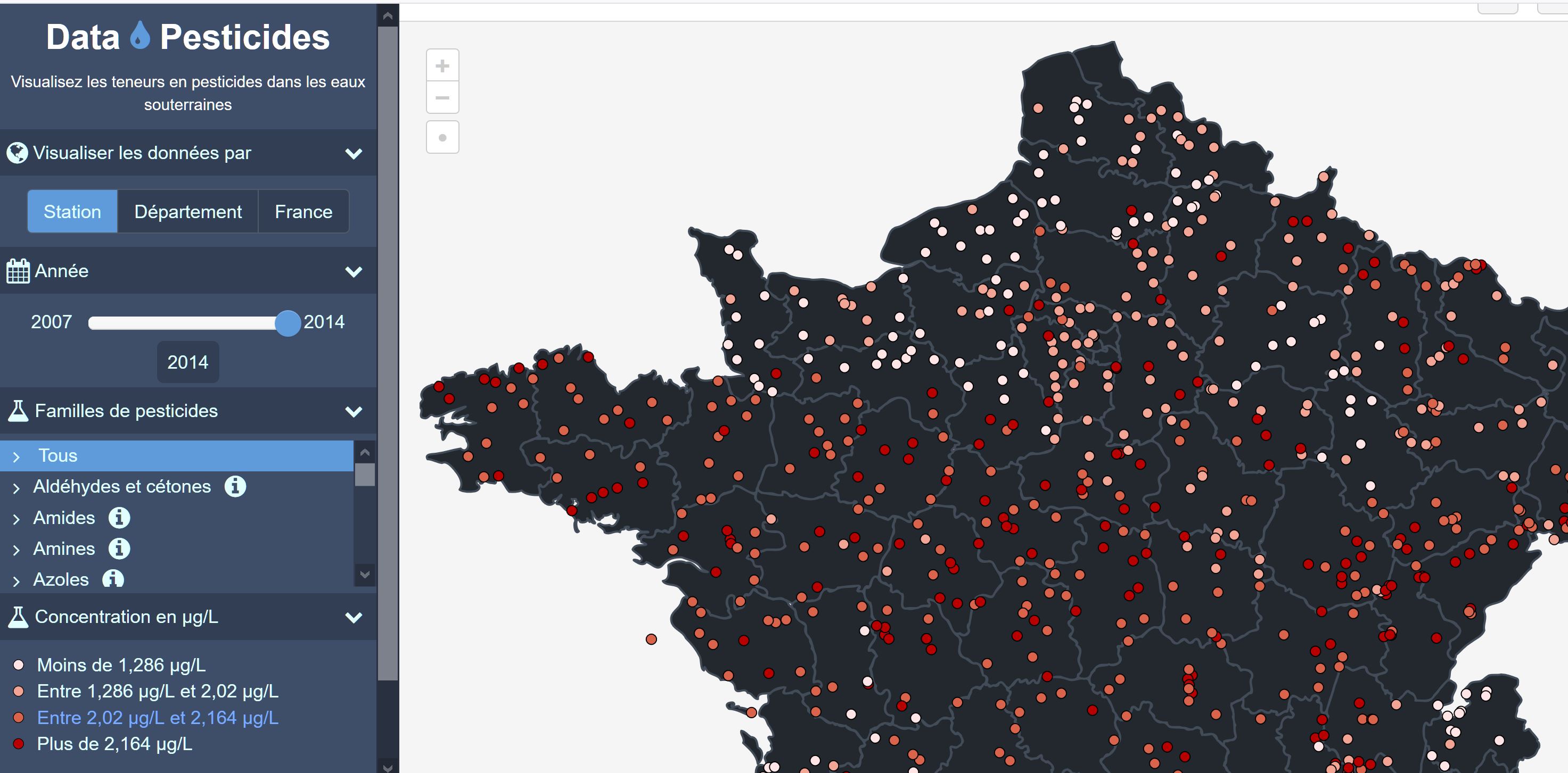Explorez les données des pesticides en eaux souterraines ! Possibilité de visualiser les données par station, département, France, selon les familles de pesticides de 2007 à 2014