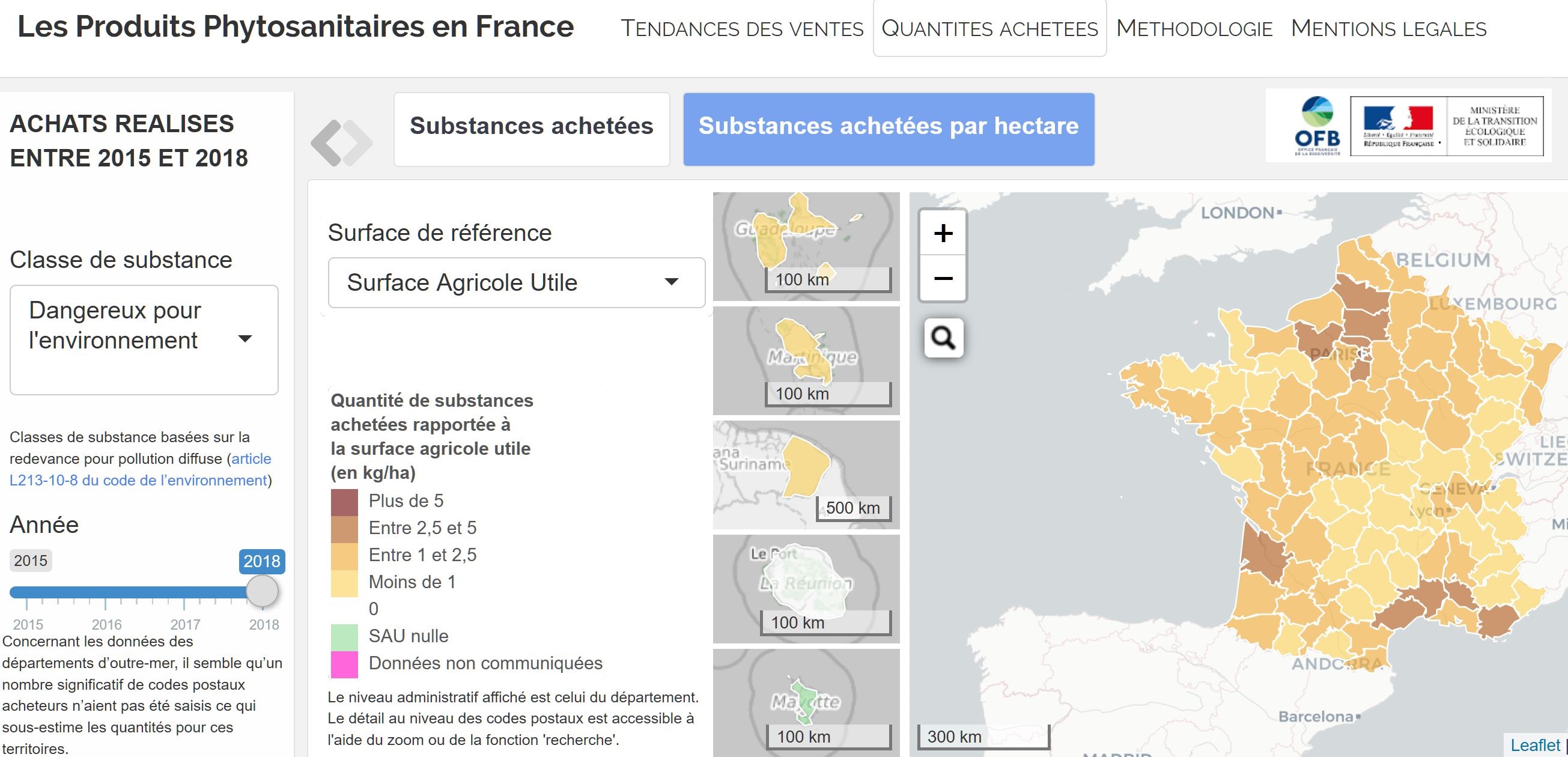 Dataviz : Un outil de visualisation qui retrace l’évolution des ventes de produits phytosanitaires par département ( 2008 – 2018) et qui renseigne sur la répartition des achats à l’échelle du code postal pour la période la plus récente (2015-2018).