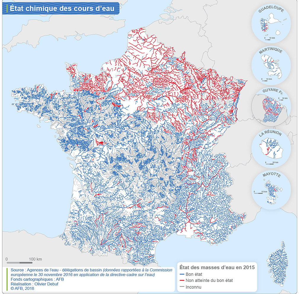 Pesticides dans les eaux de surfaceL’état d’un cours d’eau au sens de la DCE (Directive Cadre Eau) comprend deux aspects : un état chimique et un état écologique. Les pesticides sont les premières substances détectées dans les cours d’eau. Leurs concentrations varient selon les saisons et les cultures présentes sur le bassin versant. On trouve souvent la présence d'herbicides, en particulier le glyphosate et son produit de dégradation, il est surtout utilisé dans les vignes et dans les grandes cultures. L’atrazine aussi, produit pourtant interdit depuis 2003