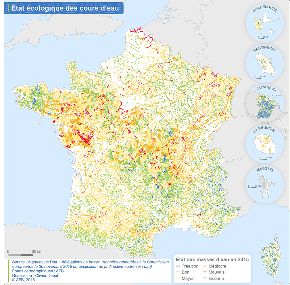 Protections de la ressouce en eau :La directive-cadre sur l'eau a imposé de découper le territoire national en masses d’eau souterraine. L’état d’une masse d’eau souterraine est déterminé par la plus mauvaise valeur de son état quantitatif et de son état chimique. Sur le plan quantitatif, une masse d’eau souterraine est en bon état lorsque les volumes prélevés dans la nappe ne dépassent pas la capacité de renouvellement de la ressource . Sur le plan qualitatif (état chimique), les déclassements des masses d’eau souterraine sont principalement dus aux nitrates et pesticides d’origine agricole. Mesures de protection : - Périmètres de protection autour des captages d’eau contre les pollutions locales, ponctuelles et accidentelles. - Bandes naturelles enherbées obligatoires entre les zones agricoles et les cours d’eau, pour filtrer les pollutions provenant des champs. Grenelle II 2010 -Pesticides interdits dans les espaces verts en 2017 et les jardins en 2019 Difficultés rencontrées : Il n’existe pas de définition légale et unique de ce qu’est un cours d’eau et la Fédération Nationale des Syndicats d’Exploitants Agricoles (FNSEA),s’est lancée dans une « opération de simplification » des normes sur les milieux aquatiques qui entraine la disparition de milliers de ruisseaux qui sont ainsi en train d’être purement et simplement rayés de la carte de France. |