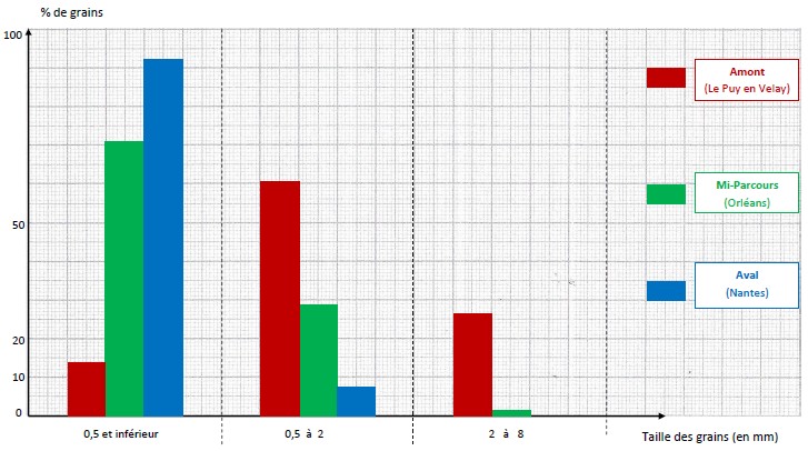 → Constater que plus le débit est important plus la taille des grains qui se déposent est importante. Les données de granulométrie permettent de tracer les histogrammes : → La taille des sédiments diminue plus on va vers l'estuaire.