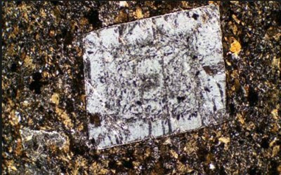 Ainsi, à l'échelle du minéral, il est possible d'établir la chronologie des cristallisations des minéraux et des déformations structurales en observant leurs relations. Il est également possible de déterminer le sens des contraintes tectoniquespar l'analyse des texture et des structures. | |