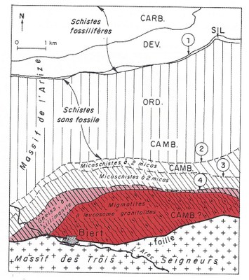 En allant du nord vers le sud : - la série (Silurien à Carbonifère) correspond à des roches sédimentaires peu ou pas transformées. - dans les roches datées du Silurien contenant de nombreux fossiles (Trilobites, Brachiopodes...) commencent à apparaître des minéraux nouveaux (séricite, chlorite, muscovite) : les roches sont métamorphisées. - Dans un complexe schisto-gréseux avec intercalations de bancs calcaires d'âge cambro-ordovicien, les minéraux cités ci-dessus sont toujours présents mais les fossiles ont disparu. Un peu plus au sud de cette zone, la structure des roches change de façon importante : elles sont formées de lits, de nature minéralogique différente, alternativement clairs (quartz) et sombres (ferro-magnésiens). - Au-delà, de nombreux changements minéralogiques s'opèrent (voir disposition des isograde). Les feldspaths qui n'étaient que microscopiques dans les roches précédents se développent et deviennent visibles à l'oeil nu : les roches sont alors appelées des gneiss. - Dans ces gneiss, l'apparition du microline correspond à un début d'anatexie. Cette zone comporte donc des migmatites. |