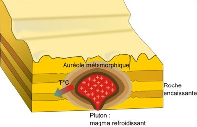 Apparaît alors une auréole de métamorphisme où l'on observe une zonation des transformations autour de l'intrusion magmatique. Dans l'environnement du pluton, les isothermes sont déformés et l e transfert de chaleur se fait par conduction. |