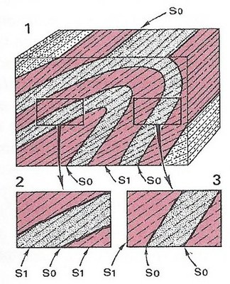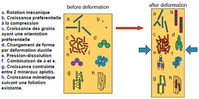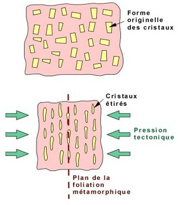 Dans une région affectée par un métamorphisme régionale, la stratification planaire initiale (notée S0) est rarement préservée. On assiste à une ré-orientation des grains suivant des plans parallèles (notés S1), perpendiculaires à la direction de compression des contraintes tectoniques. Cette réorientation est d'autant plus forte que les grains sont fins. Cela donne lieu à un feuilletage plus ou moins serré selon lequel la roche peut se débiter en lames plus ou moins épaisses et régulières. La schistosité se développe lorsque la déformation a dépassé un certain seuil et les plans de schistosité sont alors aprallèles au plan d'aplatissement. |