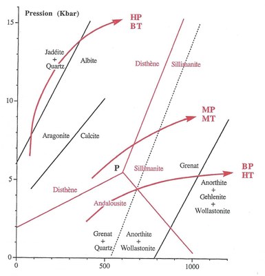 Les courbes en traits rouges sont les trajets P-T pour les trois types de métamorphisme principaux de la classification de Miyashiro :