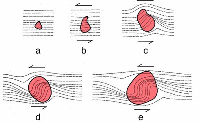Evolution de la forme d'un minéral et de la schistosité lors d'un cisaillement senestre |