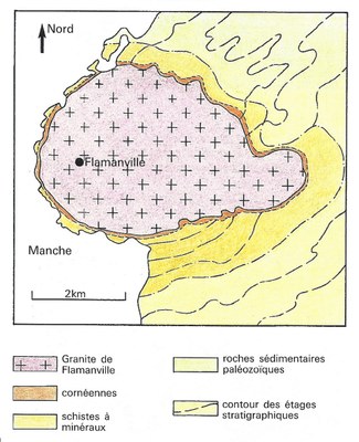 Le granite de Flamanville (granite à amphiboles) est intrusif dans une série sédimentaire plissée constituée de schistes et de calcaires datés du Dévonien-Silurien. Au contact du granite, sur environ 150 à 200 mètres, les roches sédimentaires sont affectées de modifications texturales et minéralogiques : elles forment une auréole de métamorphisme. A partir d'un affleurement de schistes et en se rapprochant progressivement du granites, on peut observer :