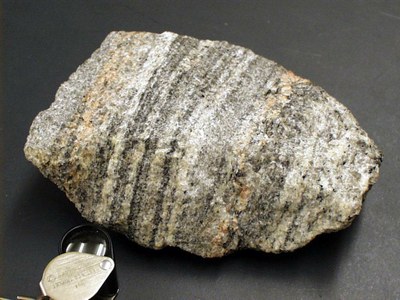 Structure des roches dont les minéraux sont arrangés ou aplatis selon des plans parallèles. A la schistosité s'ajoute une différenciation pétrographique entre des lits formant ainsi des feuillets qui se superposent | ||