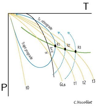 Reprenons l'exemple d'un contexte d'enfouissement puis de remontée de roches : ♦ Au cours du trajet prograde (augmentation de température mais surtout de pression), la minéralogie des roches est modifiée. Se produisent notamment des réactions de déshydratation du type : H = A + V où H est une ensemble de minéraux hydratés, A des minéraux anhydres et V la phase vapeur (H2O) L'eau libérée par la roche, de moindre densité, remonte vers la surface. ♦ Au cours du métamorphisme rétrograde, lorsque la température diminue, de telles réactions peuvent être franchies en sens inverse mais l'eau nécessaire n'est plus disponible : les associations minérales de plus hautes températures persistent. Ainsi, chaque roche rencontrée à la surface indique le plus souvent les conditions P-T maximales atteintes lors du métamorphisme prograde.