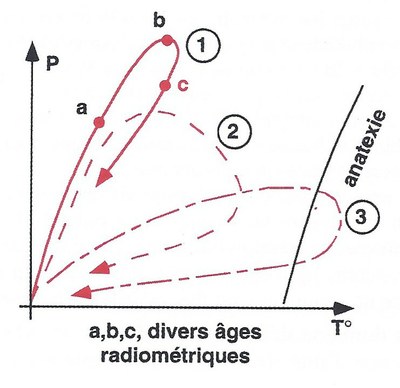 En réalisant des datations isotopiques sur des roches métamorphiques, on peut intégrer le temps sur les diagrammes P-T. On réalise alors des "chemins" pression-température-temps traduisant de façon visuelle l'évolution des séries métamorphiques dans les orogenèses. Dans la figure ci-contre, 3 chemins P,T,t sont présentés : En 1, on observe une évolution rapide vers les hautes pressions et basses températures (ex : éclogites) suivi par une retour sans réchauffement : on peut supposer que les unités profondes ont été exhumées rapidement. En 2, on assiste à un début d'évolution semblable mais un retour par des conditions de plus fortes températures indiquant un réchauffement. Ceci n'est possible que si les roches ont pu se rééquilibrer thermiquement, ce qui suppose une remontée lente. En 3, on observe une évolution de la température conduisant à une anatexie. |