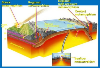 - Les différents types de métamorphisme : hydrothermal - d'impact - de contact - régional - classification de Miyashiro